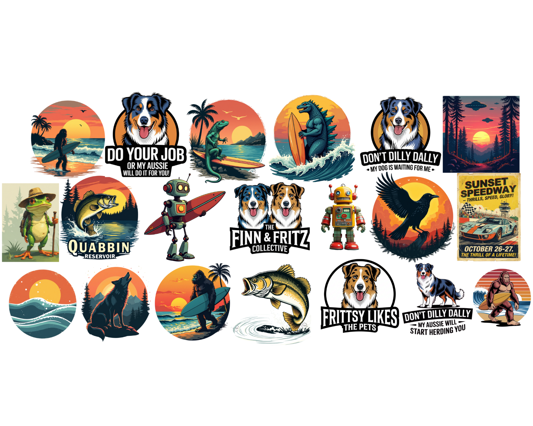 The Finn & Fritz Collective is more than a shop, it’s a playful identity for creative spirits who love surf culture, pop-retro graphics, and storytelling through apparel. At the heart of the brand are the mascots Finn and Fritz, two lovable Australian shepherds.
